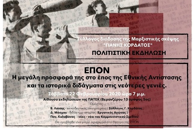 Με πρωτοβουλία του συλλόγου διάδοσης της Μαρξιστικής “Γιάνης Κορδάτος” θα πραγματοποιηθεί εκδήλωση αφιερωμένη στην ΕΠΟΝ , την νεολαία του Εθνικού Απελευθερωτικού Μετώπου (ΕΑΜ), που ιδρύθηκε στις 23 Φεβρουαρίου του 1942 και πρωτοστάτησε στον αγώνα του λαού μας για μια Ελλάδα λεύτερη, πολιτισμένη και ευτυχισμένη.