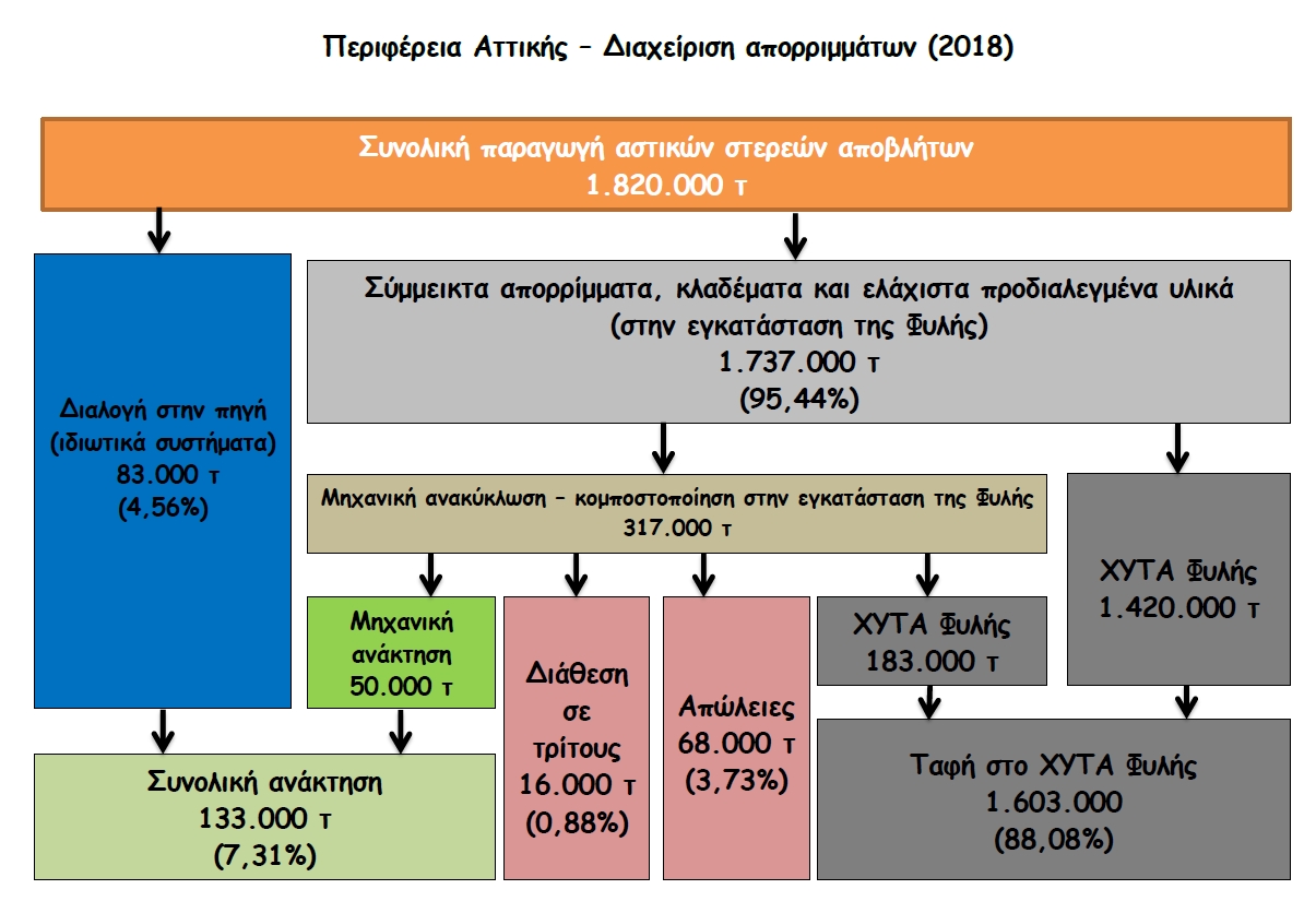 Ας μιλήσουμε με τα δεδομένα του 2018. Με μια συνολική ποσότητα αστικών στερεών αποβλήτων (ΑΣΑ) 1.820.000 τόνων, στην εγκατάσταση της Φυλής οδηγήθηκαν όλα τα σύμμεικτα, δηλαδή 1.737.000 τόνοι ή το 95,44% του συνόλου των ΑΣΑ της περιφέρειας Αττικής!!! Ένα ισχνό ποσοστό, της τάξης του 4,56%, οδηγήθηκε στα ιδιωτικά συστήματα ανακύκλωσης – «εναλλακτικής διαχείρισης» (συσκευασίες μπλε κάδου, ηλεκτρικές συσκευές, μπαταρίες κλπ.). Από αυτά που πέρασαν την πύλη της εγκατάστασης της Φυλής, 1.420.000 τόνοι οδηγήθηκαν κατευθείαν στο ΧΥΤΑ και άλλοι 317.000 τόνοι στο εργοστάσιο επεξεργασίας (ΕΜΑΚ). Από τα «προϊόντα» του ΕΜΑΚ αξιοποιήσιμα, με τον ένα ή τον άλλο τρόπο, μπορούν να θεωρηθούν μόνο οι 66.000 τόνοι, ενώ -το πιο τραγικό απ’ όλα- 183.000 τόνοι οδηγήθηκαν από την πίσω πόρτα στο ΧΥΤΑ! Με λίγα λόγια, 1.603.000 τόνοι ή το 88,08% του συνόλου των ΑΣΑ της περιφέρειας Αττικής θάφτηκαν στο ΧΥΤΑ Φυλής.
