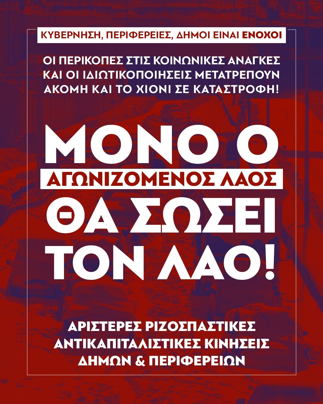 Μάχη τώρα για δημόσιες κοινωνικές υπηρεσίες, νοσοκομεία, σχολεία, ξενώνες αστέγων, πολιτική προστασία για όλο το χρόνο, δρόμους και συγκοινωνίες δημόσιες και δωρεάν με ποιοτικές υπηρεσίες γα όλους και όλες. Μάχη ενάντια σε κάθε μικρή ή μεγάλη ιδιωτικοποίηση: υγεία, παιδεία, δρόμοι, ρεύμα και νερό δεν είναι εμπορεύματα, ανήκουν στο λαό.