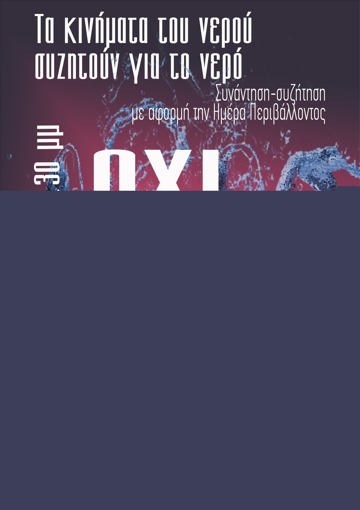 Στo πλαίσιo εκδηλώσεων για την Παγκόσμια Ημέρα Περιβάλλοντος (5 Ιουνίου) οργανώνουμε συνάντηση συλλογικοτήτων, κινημάτων και πολιτών για να συζητήσουμε για το νερό, τη διαχείριση και εκμετάλλευσή του και ειδικότερα για την ιδιωτικοποίηση του κύκλου του νερού.