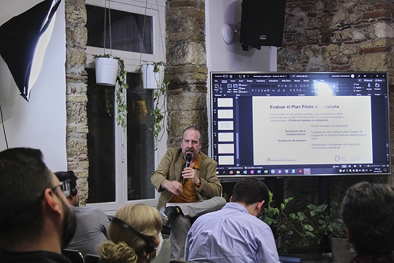 Ο Σέρζι Ραβεντός, Διευθυντής του Γραφείου Πιλοτικής Εφαρμογής Βασικού Εισοδήματος της Καταλονίας, εξήγησε πως, σε αντίθεση με άλλες πιλοτικές εφαρμογές ανά τον κόσμο που παρείχαν βασικό εισόδημα σε άτομα μεμονωμένα, αποφάσισαν να μελετήσουν ευρύτερα την καθολικότητα αλλά και τις σχέσεις που θα δημιουργηθούν σε επίπεδο τοπικής κοινωνίας και τις αλλαγές που πιθανά θα προκύψουν στις διαπροσωπικές σχέσεις εντός της οικογένειας. Με αυτά τα κριτήρια θα επιλέξουν αρχικά σε τυχαίο δείγμα 700-800 νοικοκυριά της αυτοδιοικητικής περιοχής της Καταλονίας (που θα αντιστοιχούν σε 2500 άτομα), όπου το βασικό εισόδημα θα δοθεί σε κάθε μέλος του νοικοκυριού, καθώς και δύο δήμους που καθένας θα έχει 1200-1300 περίπου μόνιμους κατοίκους και που βρίσκονται σε σχετική απόσταση μεταξύ τους. Στη δεύτερη περίπτωση θα το λάβουν όλοι οι δημότες νόμιμα διαμένοντες σε αυτούς τους Δήμους, δηλαδή 2500 άτομα επιπλέον, εκτός του 10% των πιο πλούσιων, για λόγους μεθοδολογικής προσέγγισης. Το ύψος του εισοδήματος θα είναι ίσο με το όριο φτώχειας, όπως έχει διαμορφωθεί στην Καταλονία, δηλαδή 800 ευρώ για τους ενήλικες και 300 ευρώ για το κάθε τέκνο. Το εισόδημα θα παρέχεται μηνιαία, χωρίς καμία προϋπόθεση και για δύο συναπτά έτη. Το γραφείο του σε συνεννόηση με την Αρχή Αξιολόγησης Δημόσιων Υπηρεσιών της Καταλονίας έχουν σχεδιάσει την αξιολόγηση της πιλοτικής εφαρμογής καθ’ όλη τη διάρκεια εφαρμογής και στο τέλος, με σκοπό να εξάγουν συμπεράσματα χρήσιμα και για τον ίδιο τον λαό της Καταλονίας αλλά – όπως αποδείχθηκε από την ενδιαφέρουσα συζήτηση που ακολούθησε – και για τα ευρωπαϊκά και τα ελληνικά δεδομένα.