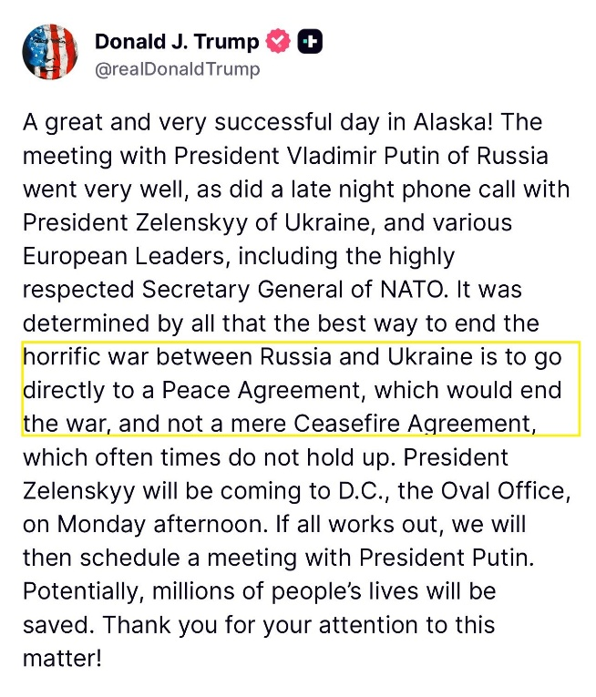 Ο αμερικανός πρόεδρος προσήλθε στην συνάντηση με την ρώσο ομόλογό του στην αμερικανική αεροπορική βάση έχοντας οδηγήσει στα άκρα την πολιτική του μαστίγιου και του καρότου. Πριν εκλεγεί πρόεδρος υποσχόταν ότι θα τελειώσει τον πόλεμο σε 1 ημέρα. Αμέσως μετά την εκλογή του τον Φεβρουάριο του 2025, η συνάντηση των υπουργών Εξωτερικών Μάρκο Ρούμπιο και Σεργκέι Λαβρόφ στο Ριάντ της Σαουδικής Αραβίας δημιούργησε ελπίδες για ειρήνη στο μέτωπο της Ουκρανίας. Οι διαπραγματεύσεις που ακολούθησαν στην Κωνσταντινούπολη μεταξύ Ρώσων και Ουκρανών εμπειρογνωμόνων έδειξε ότι το εμπόδιο είχε πάψει να είναι η Ουάσιγκτον κι ότι μεταξύ των δύο πάλαι ποτέ υπερδυνάμεων είχαν δοθεί οι προσήκουσες εγγυήσεις. Το αδιέξοδο που ακολούθησε έδειξε ότι το εμπόδιο ήταν η Ουκρανία…