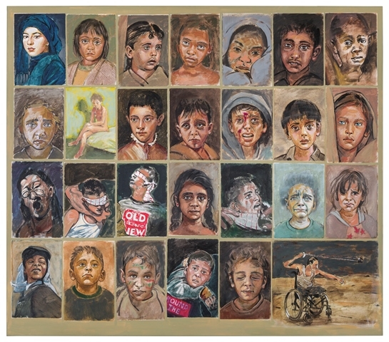 Ανάμεσα στα έργα που εκτίθενται είναι τρία που είχαμε τη χαρά να τα απολαύσουμε κάποιοι άνθρωποι, εν τη δημιουργία. Και να συζητήσουμε ουκ ολίγες φορές μαζί του σχετικά μ’ αυτά. «Το βλέμμα», με τα μάτια των παιδιών του κόσμου, τη λύπη και τελικά την οργή της ιντιφάντα,  «η βιογραφία» και «ο νόμος της βαρύτητας», που ήθελε, όπως έλεγε – με τη συνείδηση του πως οι άνθρωποι αλλάζουν τον κόσμο και πρέπει να γίνονται κοινωνοί – να μην πουληθούν αλλά να δοθούν σε κάποια πινακοθήκη ώστε να χαριστούν στην απόλαυση και τη γνώση των ανθρώπων κι όχι στη στέγη (όσο φιλόξενη κι αν είναι παραμένει κλειστή) ενός συλλέκτη.
