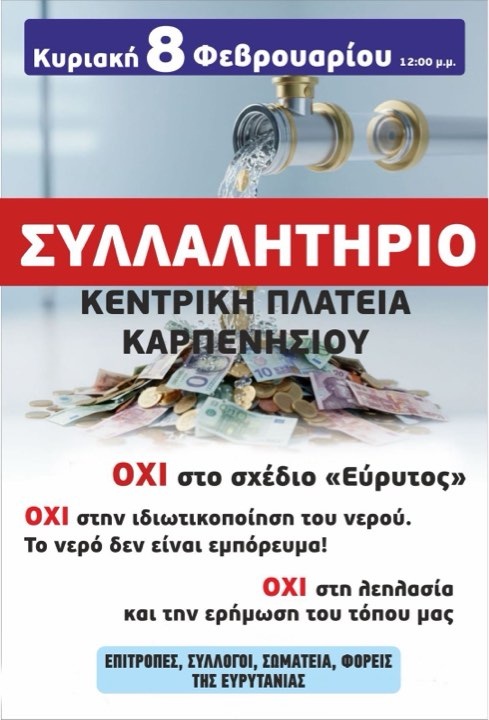 Η Επιτροπή αυτή σε συνεργασία με την Κίνηση Πολιτών για την Προστασία του Ευρυτανικού Περιβάλλοντος, τους τοπικούς συλλόγους και θεσμικούς φορείς, οργανώνει σαν συνέχεια των μέχρι τώρα δράσεων της, Συλλαλητήριο στις 8 Φλεβάρη 2026 στην κεντρική πλατεία Καρπενησίου ώρα 12.00 στο οποίο και σας καλούμε να παρευρεθείτε και εκπρόσωπός σας εάν επιθυμεί να μιλήσει στην εκδήλωση αυτή.