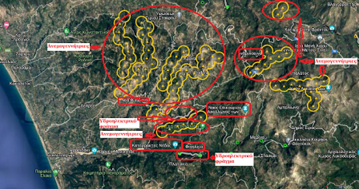 Ένας περιβαλλοντικός όλεθρος της Ηλείας, της Μεσσηνία και Αρκαδίας είναι σε εξέλιξη διότι μετά τις προθέσεις για εγκατάσταση εκατοντάδων τεραστίων Ανεμογεννητριών στα ορεινά της Ηλείας στον Ερύμανθο και βουνά της Επαρχίας Ολυμπίας (στην Ανδρίτσαινα, στην Φιγαλεία, στην Μίνθη κλπ.), τις εξέδρες Γεωτρήσεων στο Κυπαρισσιακό Κόλπο, προωθείται ο πνιγμός παραδείσων της φύσης της Ηλείας, η καταστροφή πανέμορφων οικότοπων και καταρρακτών.