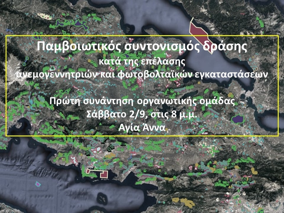 Στο επίκεντρο ήταν η ενημέρωση για τις τελευταίες εξελίξεις και, κυρίως, η αναζήτηση τρόπων για να αντιμετωπιστεί η λαίλαπα ανεμογεννητριών και φωτοβολταϊκών πανέλων, που μαστίζει όχι μόνο τον Ελικώνα, αλλά ολόκληρο το νομό Βοιωτίας. Κι όλα αυτά, κάτω από το βαρύ κλίμα των συνεπειών της τελευταίας καταστροφικής φωτιάς, της οποίας οι φλόγες δεν έχουν σβήσει καλά-καλά ακόμη.