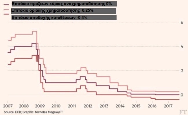 Όπως φαίνεται στο διάγραμμα που παραθέτουμε, τα επιτόκια ξεκίνησαν να μειώνονται στο τέλος του 2008, με το ξέσπασμα της κρίσης, ενώ στο σημερινό τους …βάθος βρίσκονται σχεδόν 1,5 χρόνο. Τα έκτακτα μέτρα διήρκεσαν σχεδόν μια δεκαετία που αντιπροσωπεύει το μεγαλύτερο μέρος της ζωής του ευρώ.