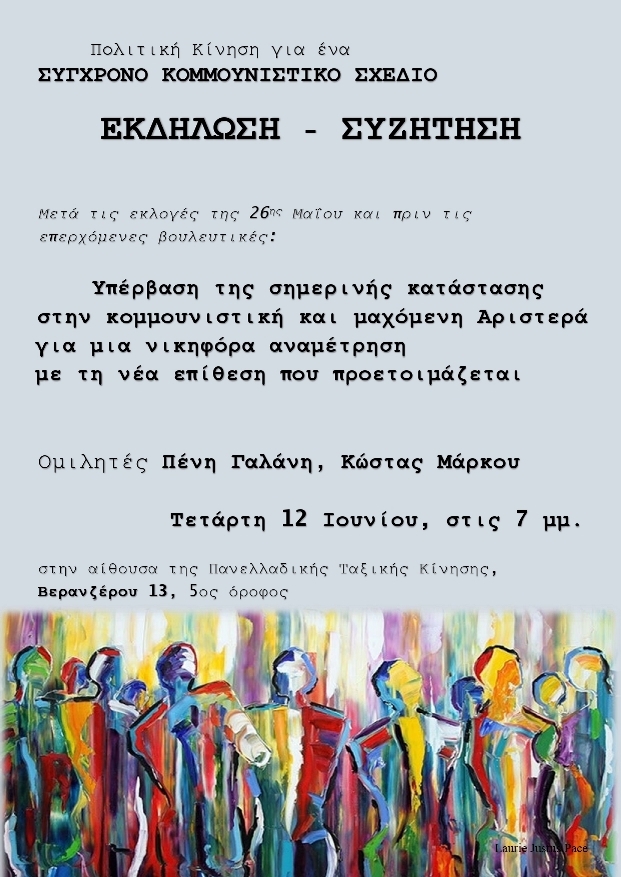 Η Πολιτική Κίνηση για ένα Σύγχρονο Κομμουνιστικό Σχέδιο διοργανώνει εκδήλωση συζήτηση με θέμα: «Μετά τις εκλογές της 26ης Μαΐου και πριν τις επερχόμενες βουλευτικές», την Τετάρτη 12 Ιούνη στις 7μμ στην αίθουσα της Πανελλαδικής Ταξικής Κίνησης, Βερανζέρου 13, 5ος όροφος (Πλατεία Κάνιγγος).