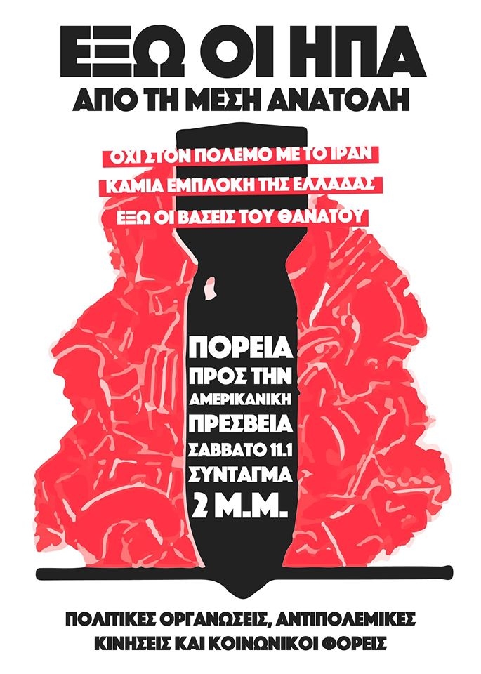 Είναι η στιγμή να ενώσουμε τη φωνή μας με τα  αντιπολεμικά κινήματα σε όλη τη γη, να καταδικάσουμε τις εγκληματικές ενέργειες των ΗΠΑ και να απαιτήσουμε την αποχώρηση των δυνάμεών τους από τη Μέση Ανατολή.  Ένας τέτοιος αντιπολεμικός προσανατολισμός στην Ελλάδα σημαίνει την εναντίωσή μας στις αμερικανονατοϊκές στρατιωτικές βάσεις, το ΝΑΤΟ και την ΕΕ. Η περσινή χρησιμοποίηση της Σούδας ως εφαλτήριο για στρατιωτικό χτύπημα στη Συρία και η αναβάθμισή της σε βάση που οι Αμερικάνοι «σταυροφόροι» θα χρησιμοποιούν κατά το δοκούν χωρίς καμία τυπική έγκριση, οι πρόσφατες συμφωνίες για νέες αμερικανονατοϊκές βάσεις και η τοποθέτηση πυρηνικών στον Άραξο, δεν αφήνουν κανένα περιθώριο εφησυχασμού.