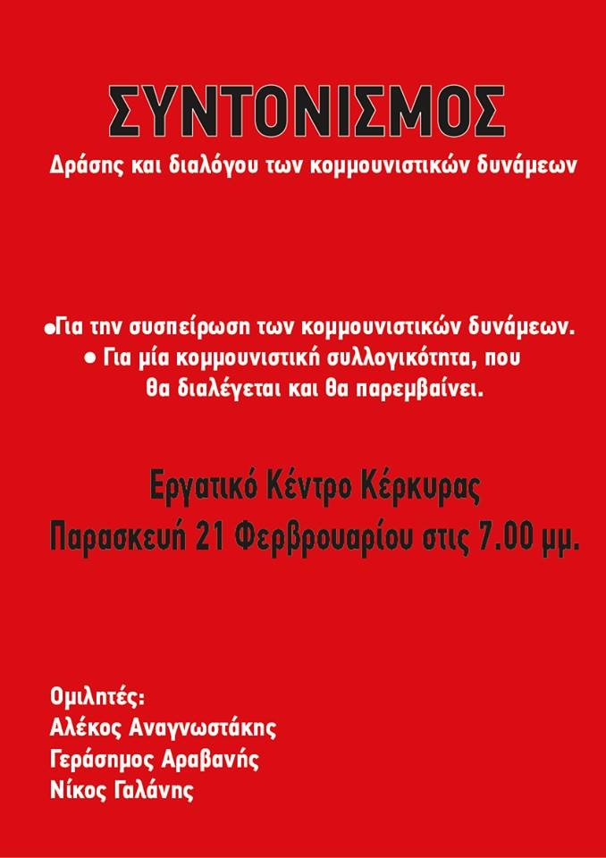 Την Παρασκευή 21 Φεβρουαρίου και ώρα 700 μμ στο Εργατικό Κέντρο Κέρκυρας διοργανώνουμε την πρώτη παρουσίαση των θέσεων μας για την συσπείρωση των κομμουνιστικών δυνάμεων και για μια πολιτική συλλογικότητα των κομμουνιστών που θα διαλέγεται και θα παρεμβαίνει.