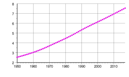 Α) Ο πολλαπλασιασμός του πληθυσμού του σαν είδος. Σύμφωνα με το παραπάνω μοντέλο ο ζωτικός χώρος της υδρογείου αντιστοιχεί σε ένα μέγιστο πληθυσμό 10,5 περίπου δισεκατομμυρίων ανθρώπων. Ο σημερινός παγκόσμιος πληθυσμός αγγίζει τα 7,5 δισεκατομμύρια. (USA Census Bureau). Στο διάγραμμα φαίνεται η εξέλιξη του παγκόσμιου πληθυσμού από το 1950 ως τις μέρες μας και μπορούμε να δούμε και το ρυθμό αύξησης από την κλίση της γραφικής παράστασης. Φυσικά σύμφωνα με μαθηματικό μοντέλο ο ρυθμός αύξησης αναμένεται να ελαττωθεί. Με ποιο τρόπο θα συμβεί όμως αυτή η μείωση; Με σταδιακή μείωση του ρυθμού γεννήσεων; Με σταδιακή αύξηση του ρυθμού θανάτων; Η με συνδυασμό και των δύο παραγόντων; Και από ποιους παράγοντες – παραμέτρους καθορίζεται αυτό; Όπως και να έχει η αναζήτηση ζωτικού χώρου υπάρχει και στον άνθρωπο και αυτό δημιουργεί μικρότερες ή μεγαλύτερες πιέσεις στο ζωτικό χώρο άλλων ειδών.