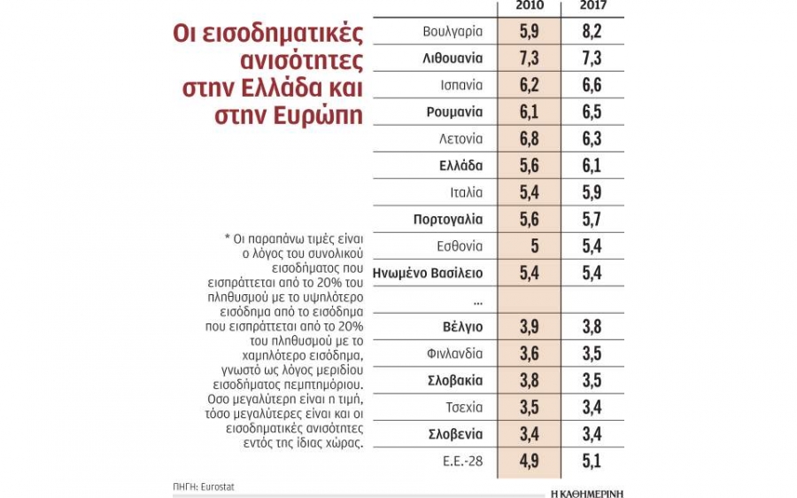 Όσον αφορά την Ελλάδα με βάση τα στοιχεία που επεξεργάστηκε η πέρα κάθε υποψίας Eurostat, η χώρα μας βρίσκεται ψηλά στη λίστα των χωρών με μεγάλες εισοδηματικές ανισότητες (στοιχεία του 2017). Συγκεκριμένα, βρίσκεται στην έκτη θέση μεταξύ των 28 χωρών-μελών της ΕΕ! Σύμφωνα με τον παραπάνω πίνακα στην Ελλάδα, το 2017 ο λόγος αυτός ήταν 6,1. Με άλλα λόγια το εισόδημα του 20% του πληθυσμού με το υψηλότερο εισόδημα ήταν 6,1 φορές μεγαλύτερο από το εισόδημα σε σχέση με το εισόδημα του 20% του πληθυσμού με το χαμηλότερο εισόδημα.