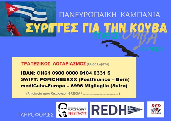 Ο ευρωπαικός οργανισμός medicuba–europa είναι μια οργάνωση με παραρτήματα σε 14 ευρωπαϊκές χώρες, που μαζεύει και στέλνει ιατρικό υλικό στην Κούβα . Ο πρόεδρός της, Φράνκο Καβάλι θεωρεί πολύ σημαντική την υποστήριξη στο δημόσιο σύστημα υγείας της Κούβας και η οργάνωσή του έχει στείλει μέχρι το 2018 φαρμακευτικό υλικό αξίας 12 εκατ. ευρώ. Τη διεξοδική αποτίμηση της Πανευρωπαϊκής Συνάντησης Αλληλεγγύης με την Κούβα στη Σλοβενία (11/2018), μπορείτε να τη βρείτε αναρτημένη στο blog «CubaniaGrecia». H καμπάνια είναι ανοιχτή προς όλες τις συλλογικότητες και φίλους της Κούβας, που μπορούν ατομικά (να στείλουν) ή συλλογικά (να συγκεντρώσουν και στείλουν) χρήματα στον ελβετικό λογαριασμό. Σημειώνεται ότι στην προηγούμενη καμπάνια κατά του αποκλεισμού (εμπάργκο) της Κούβας συμμετείχαν πάνω από 40 συλλογικότητες από τη χώρα μας.