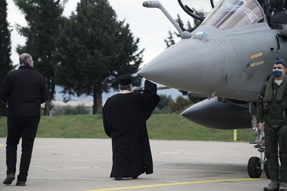 Η δοξολογία για την έλευση των γαλλικών μαχητικών Ραφάλ προσπαθεί να αντλήσει αναφορές από την επαναστατική προτροπή «μάχου υπέρ πίστεως και πατρίδος». Ωστόσο, οι αγορές οπλικών συστημάτων για τις ανάγκες της ευρωατλαντικής συμμαχίας κάνουν την εικόνα, να παραπέμπει περισσότερο στον στίχο «λευκαίνει με φούμο και κατράμι τη μουσούδα γραικύλων χριστιανών» στο «Ελλάς-Ελλήνων-Χριστιανών» του Βάρναλη.