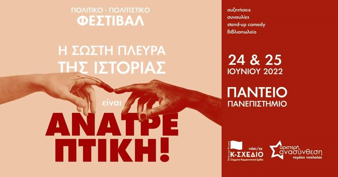Ο τομέας νεολαίας της Αριστερής Ανασύνθεσης και οι Νέοι/Νέες για ένα Σύγχρονο Κομμουνιστικό Σχέδιο διοργανώνουμε διήμερο πολιτικό και πολιτιστικό φεστιβάλ στις 24 και 25 Ιουνίου στο κήπο του Παντείου Πανεπιστημίου.