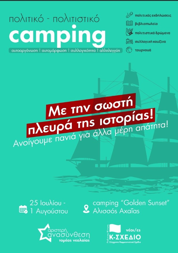 Από τις 25 Ιουλίου μέχρι και τη 1 Αυγούστου σας περιμένουμε στο πανέμορφο κάμπινγκ «Golden Sunset» στον Αλισσό Αχαΐας. Συνεχίζουμε να προσπαθούμε να απευθυνθούμε σε νέους και νέες, που δεν εφησυχάζουν στην κανονικότητα, σε νέους και νέες, που σε πείσμα των καιρών θέλουν να δουν τα πράγματα να πηγαίνουν αλλιώς.