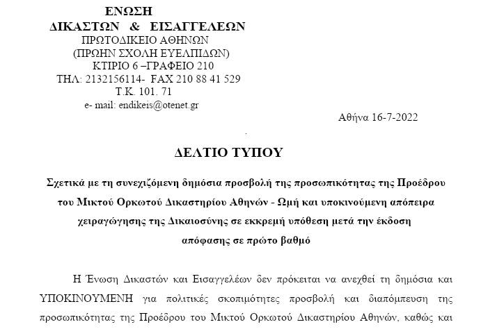 Αντίθετα, το από 16/7/2022 δελτίο τύπου, γραμμένο σε γλώσσα ανοίκεια και μορφή αλλόκοτη για κείμενο δικαστικής ένωσης, δημιουργεί εύλογη απορία για τον λόγο έκδοσής του, με δεδομένο ότι όσα χρειαζόταν να ειπωθούν, περιέχονταν ήδη στο από 14/7/2022 δελτίο.