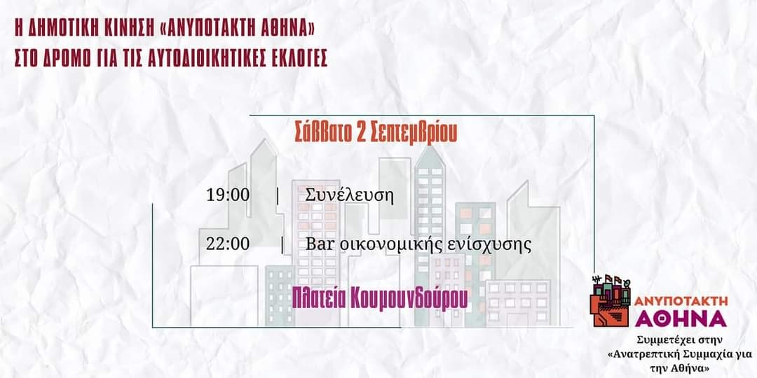 Ως Ανυπότακτη Αθήνα, πιστέψαμε εξ αρχής σε αυτό το εγχείρημα, ως το αναγκαίο και αυτονόητο βήμα στην πόλη μας , για αυτό αυτό το Σάββατο, διοργανώνουμε συνέλευση ώστε να συζητήσουμε βασικές αιχμές της παρέμβασης μας και να παρουσιάσουμε τους υποψηφίους μας. Πρόκειται για έναν συνδυασμό με ανθρώπους διαφορετικών γενεών, εργασιακών και επιστημονικών κλάδων, πολιτικών διαδρομών και αφετηριών που συμμετέχουν στους αγώνες και τα κινήματα της πόλης εδώ και πολλά χρόνια.
