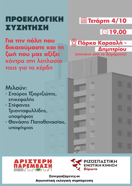 ΠΡΟΕΚΛΟΓΙΚΗ ΣΥΓΚΕΝΤΡΩΣΗ/ΣΥΖΗΤΗΣΗ | Για την πόλη που δικαιούμαστε και τη ζωή που μας αξίζει κόντρα στη λεηλασία τους για τα κέρδη!