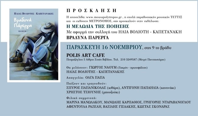 Σε μια γιορτή Ποίησης και Μελωδίας σας προσκαλούν οι εκδόσεις Μετρονόμος, η σχολή παραδοσιακής μουσικής ΤΕΤΤΙΞ και η αιρετική ιστοσελίδα www.mousapolytropos.gr Αφορμή η ποιητική συλλογή του δημοσιογράφου Ηλία Βολιώτη – Καπετανάκη, «Βραδυνά Πάρεργα». Η Μελωδία της Ποίησης φιλοξενείται στο Art Polis Cafe, αίθριο της Στοάς του Βιβλίου, Πεσμαζόγλου 5 (Τηλέφωνο: 210 – 3249587, μετρό Πανεπιστήμιο), την Παρασκευή 16 Νοεμβρίου 2018, στις 9 μ. μ.