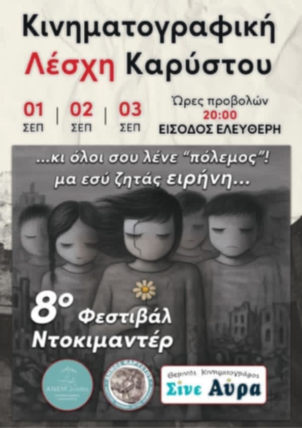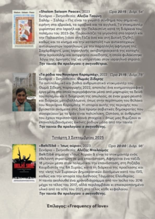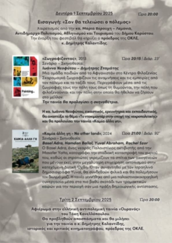 Σας προσκαλούμε στις 1, 2 και 3 Σεπτεμβρίου 2025 στον θερινό κινηματογράφο «Αύρα»για να παρακολουθήσουμε πέντε(5) συγκλονιστικά ντοκιμαντέρ για τον εφιάλτη του πολέμου και την ανάγκη για ειρήνη, δικαιοσύνη και ισότητα.