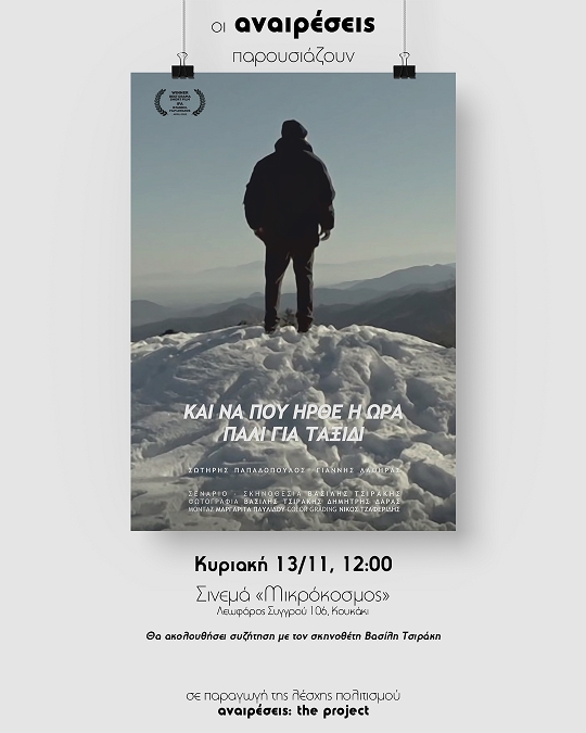 ΠΟΛΙΤΙΣΜΟΣ Η ταινία «Και να που ήρθε η ώρα για ταξίδι» στην Αθήνα Από KOMMON - 12 Νοεμβρίου, 2022 0 574 FacebookX Η ταινία μικρού μήκους “Και να που ήρθε η ώρα για ταξίδι” σε πρώτη προβολή στην Αθήνα την Κυριακή 13 Νοέμβρη 12 το μεσημέρι. Σινέ “Μικρόκοσμος” Λ. Συγγρού 106, Κουκάκι. Θα ακολουθήσει συζήτηση.