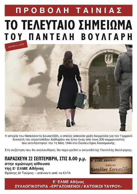 Παρασκευή 22 Σεπτέμβρη, στις 8.00 μ.μ. στην ομώνυμη αίθουσα της Ε’ ΕΛΜΕ Αθήνας Θράκης 30 Ταύρος – απέναντι από τα ΕΛΤΑ