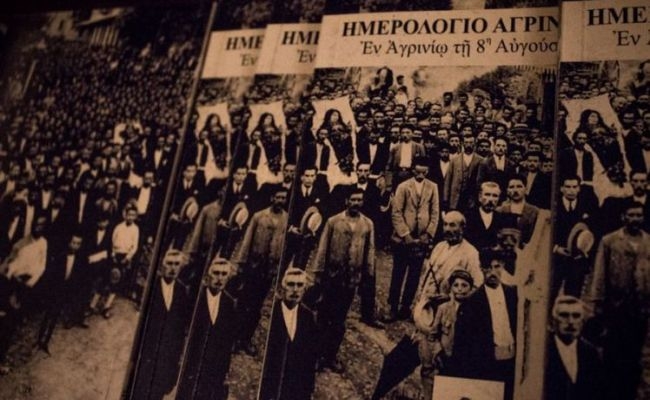 «Από το πρωί της Κυριακής 8 Αυγούστου, οι απεργοί άρχισαν να συγκεντρώνονται στο χώρο της Αγίας Σωτήρας, με μαύρες σημαίες πάνω στις οποίες έγραφαν: “Δικαία απαίτησις, ή 100 δράμια ψωμί ή ένα χρόνο απεργία”. Γύρω στις 8 το πρωί είχαν συγκεντρωθεί γύρω στους 8.000 απεργούς. Οι αρχές είχαν τοποθετήσει ισχυρή δύναμη χωροφυλακής στην ”καμπή” της οδού Αγρινίου-Αμφιλοχίας, λίγο πιο πάνω από το Ταχυδρομείο και δύναμη Ευζώνων, που είχε έρθει από το Μεσολόγγι, έξω από το εξοχικό κέντρο “Χαραυγή”. (Το Ταχυδρομείο βρισκόταν στο οίκημα Κιτσοπάνου, περίπου στη δεξιά γωνία Παπαστράτου και Κιλκίς και η «καμπή» είναι το τέρμα της Παπαστράτου και αρχή της Βενιζέλου. Το εξοχικό κέντρο “Χαραυγή” βρισκόταν στο χώρο δίπλα από το σημερινό Εργατικό Κέντρο προς Πολυχρόνη.)