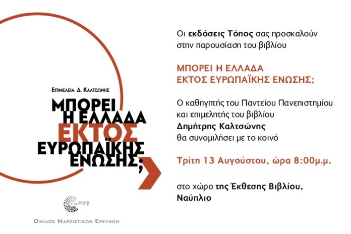 Την Τρίτη 13 Αυγούστου, στις 8:00 το απόγευμα, ο καθηγητής του Πάντειου Πανεπιστημίου κι επιμελητής του τόμου «Μπορεί η Ελλάδα εκτός Ευρωπαϊκής Ένωσης;» θα μιλήσει για το βιβλίο και θα συνομιλήσει με το κοινό, στο χώρο της έκθεσης βιβλίου.