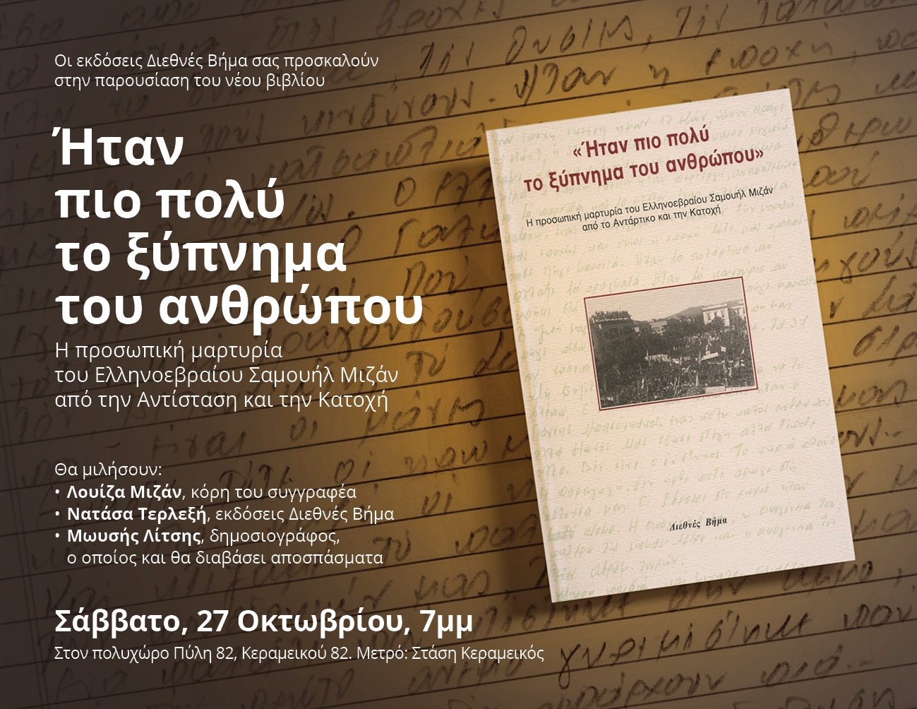 Οι εκδόσεις Διεθνές Βήμα παρουσιάζουν μια συγκλονιστική, ανέκδοτη μέχρι χθες μαρτυρία από την εποχή του Αντάρτικου και της Κατοχής: αυτή του Ελληνοεβραίου Σαμουήλ Μιζάν (1925-2011). Πρόκειται για μια απόθεση ψυχής που γράφτηκε το 1995, όταν ο Μιζάν έκλεινε τα 70 του χρόνια. Ένα αυτοβιογραφικό κείμενο γραμμένο με το χέρι σε ένα τετράδιο, το οποίο οι κόρες του ανακάλυψαν μόλις το 2017, ψάχνοντας για κάποιες αποδείξεις μέσα σε ένα συρτάρι στο πατρικό τους σπίτι.