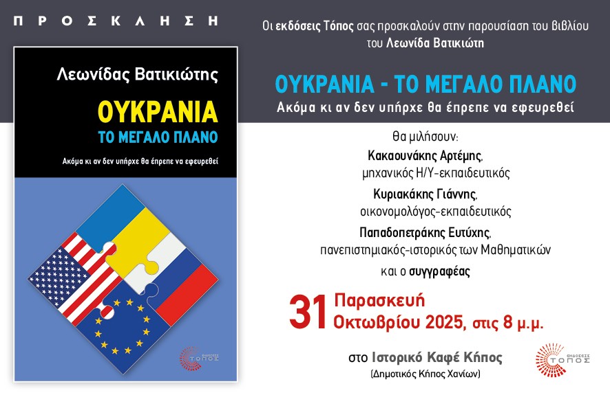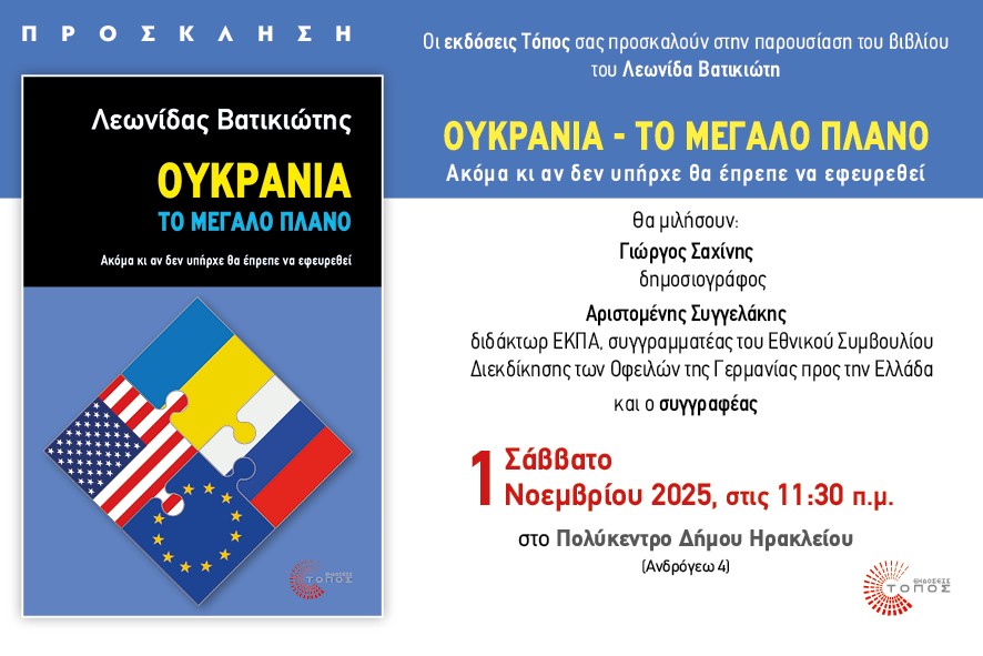 Στην Κρήτη θα παρουσιαστεί το βιβλίο του Λεωνίδα Βατικιώτη «Ουκρανία – το μεγάλο πλάνο, ακόμα κι αν δεν υπήρχε θα έπρεπε να εφευρεθεί» (εκδ. Τόπος).