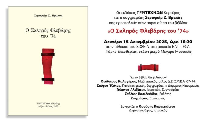 Τη Δευτέρα 15 Δεκεμβρίου 2025  και ώρα 18:30, γίνεται η παρουσίαση του βιβλίου ” Ο Σκληρός Φλεβάρης του ’74”.Η παρουσίαση θα γίνει στο μουσείο ΕΑΤ-ΕΣΑ , στα ίδια κτίρια  που βασανίστηκαν άγρια εκατοντάδες αγωνιστές της δημοκρατίας.Το βιβλίο αναφέρεται στις συλλήψεις μελών της ΚΝΕ που είχαν συμμετάσχει στην κατάληψη του Πανεπιστημίου της Πάτρας, τον Νομέμβρη του ’73.