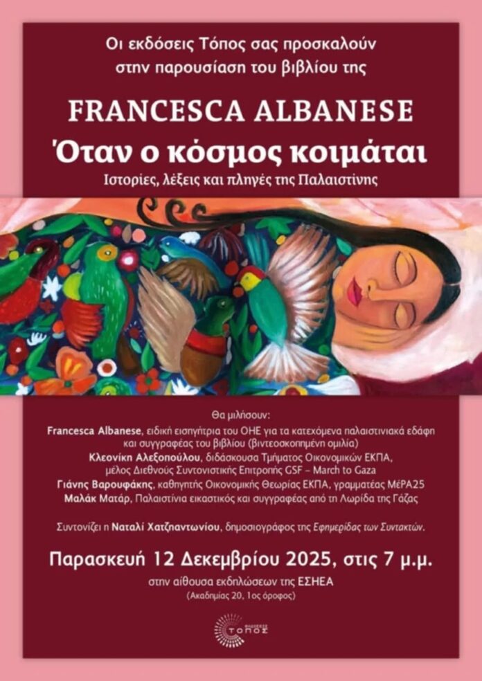 Το βιβλίο της Φραντζέσκα Αλμπανέζε με τίτλο «Όταν ο κόσμος κοιμάται: Ιστορίες λέξεις και πληγές της Παλαιστίνης» θα παρουσιαστεί από τις εκδόσεις Τόπος την Παρασκευή, 12 Δεκεμβρίου στις 19.00 στην ΕΣΗΕΑ (Ακαδημίας 20, 1ος όροφος).