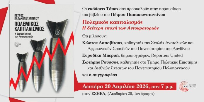 Την Δευτέρα 20 Απριλίου στις 7 μμ θα παρουσιαστεί στην ΕΣΗΕΑ το νέο βιβλίο του Π. Παπακωνσταντίνου με τίτλο Πολεμικός καπιταλισμός – η δεύτερη εποχή των αυτοικρτατοριών (εκδόσεις Τόπος).