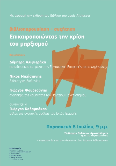 Οι εκδόσεις Εκτός Γραμμής σάς προσκαλούν στη συζήτηση με αφορμή την έκδοση του βιβλίου του Louis Althusser Για την κρίση του μαρξισμού (μετάφραση: Τάσος Μπέτζελος – σειρά: Θεωρία | Αλτουσέρ) που θα πραγματοποιηθεί στον Κήπο του Συλλόγου Ελλήνων Αρχαιολόγων (Ερμού 134, Θησείο) την Παρασκευή, 8 Ιουλίου, 9 μ.μ.