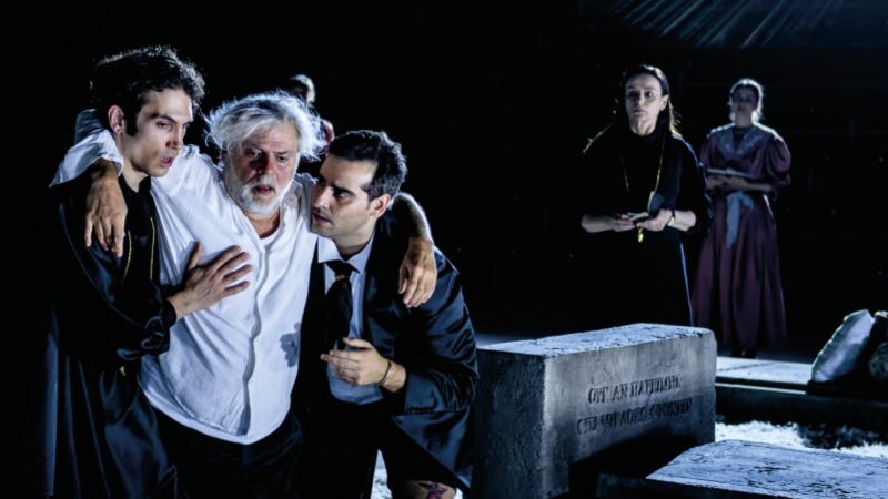 O σκηνικός χώρος, η ορχήστρα, αναπαριστά ένα νεκροταφείο και με την έναρξη της παράστασης παρακολουθούμε κάποια άτομα να καθαρίζουν και να τακτοποιούν το χώρο. Ντυμένοι σαν υπάλληλοι ξενοδοχείου, μεταφέρουν με καροτσάκια αντικείμενα τραπεζιού και φαγώσιμα, ίσως να ετοιμάζουν ένα νεκρόδειπνο.