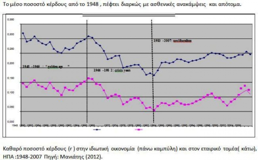 …Το 1983 – 87 το ποσοστό κέρδους τόσο στην ελληνική όσο και στην αμερικάνικη οικονομία έπεσε στο ιστορικά χαμηλότερο, μεταπολεμικά, σημείο. Από 30% που ήταν περίπου γύρω στο 1960, έπεσε στο 10%, δηλαδή 67% κάτω!!! (δες γραφική παράσταση). Η πολιτική του νεοφιλελευθερισμού, που επιλέχτηκε στη συνέχεια, οδήγησε σε μια ασθενική άνοδο του ποσοστού κέρδους, στο 16% περίπου ( στα μισά του 1960). Για να βυθιστεί ξανά με την κρίση του 2008.